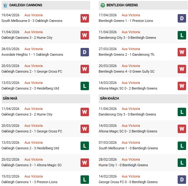 Thống kê phong độ Oakleigh vs Bentleigh Greens: