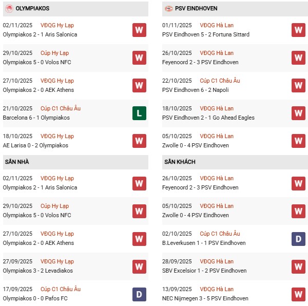 Thành tích đối đầu Olympiacos gặp PSV:
