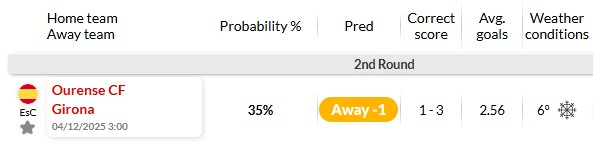 Girona rõ ràng mạnh hơn nhưng phong độ không đủ thuyết phục để tin vào một chiến thắng quá cách biệt. Ourense đang có trạng thái thi đấu ổn định, đặc biệt là khả năng phòng ngự khó chịu trên sân nhà. Việc Girona thường gặp khó trước lối đá lùi sâu khiến kèo chấp 1 bàn trở nên không quá dễ vượt qua. Trận đấu có thể diễn ra chặt chẽ hơn dự kiến, và nếu Girona thắng thì cách biệt cũng khó vượt quá 1 bàn.