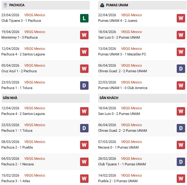 Thống kê phong độ Pachuca vs Pumas UNAM: