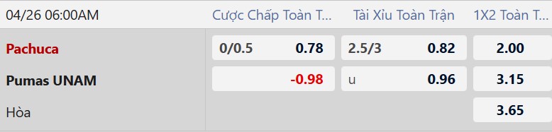 Thông tin tỷ lệ kèo Pachuca vs Pumas UNAM: