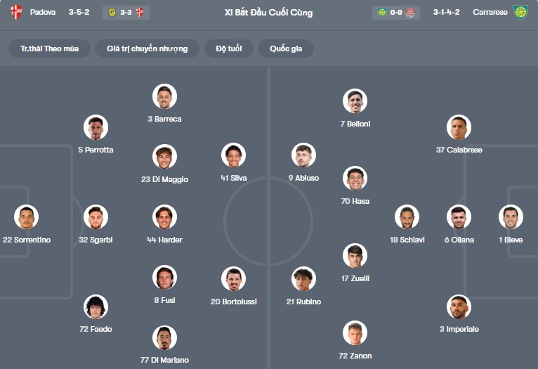 Đội hình dự kiến Padova vs Carrarese: