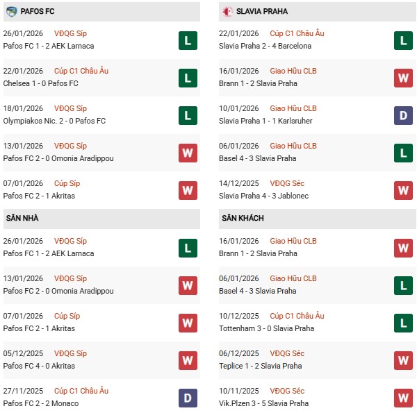 Phong độ đôi bên không nhiều chênh lệch khi cùng không thắng 3/5 trận gần nhất. Ở trận đấu tới, Pafos có lợi thế sân nhà và đang chơi tốt ở thời gian này khi bất bại 7/8 trận vừa qua. Đó là điểm tựa để họ tin vào 1 chiến thắng trước Slavia Praha, cũng như nuôi hi vọng mong manh lọt vào vòng play-off.