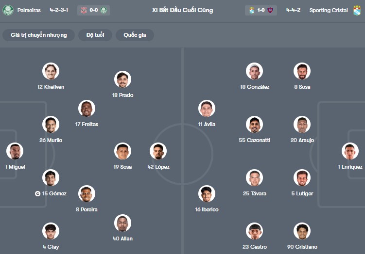 Đội hình dự kiến Palmeiras vs Sporting Cristal: