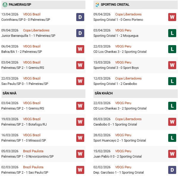 - Trên sân nhà, Palmeiras thắng cả 2 trận trước Sporting Cristal.