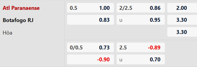 Tỷ số lẻ: 5/7 trận gần đây giữa Atletico Paranaense và Botafogo đều kết thúc với tỷ số lẻ. 4/6 trận vừa qua của Atletico Paranaense và 4 trận gần nhất của Botafogo cũng có số bàn thắng không chia hết cho 2.