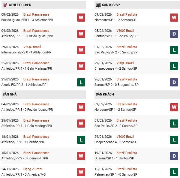 Lúc này, sân nhà đang là điểm tựa vững chắc của Atletico Paranaense. Theo thống kê, thắng 6/7 trận gần nhất tại tổ ấm, trong đó có tới 5 trận giữ sạch lưới. Lịch sử đối đầu cũng ủng hộ Atletico Paranaense, thể hiện qua chiến thắng trong lần gần nhất tiếp đón Santos tại Serie A,