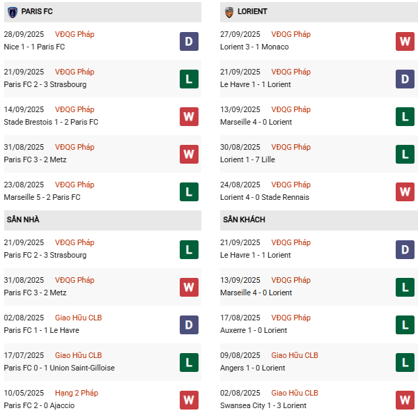 - Trên sân nhà, Paris FC thắng 1, hòa 2 trước Lorient.