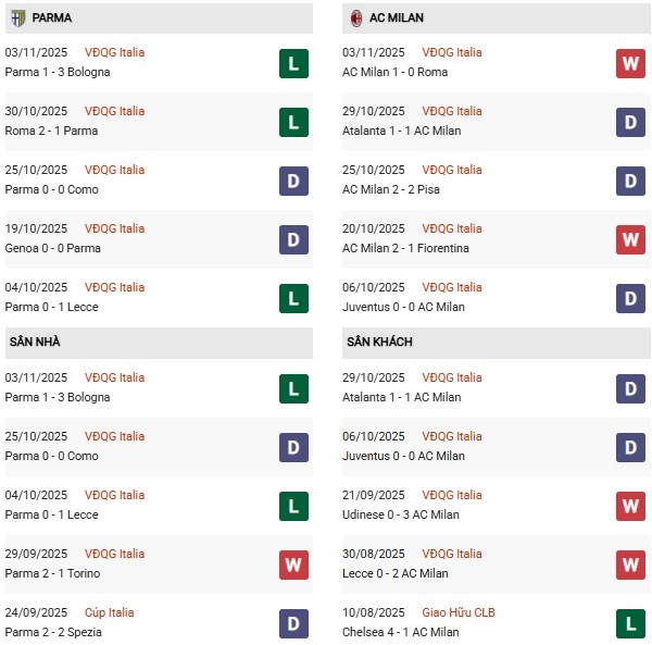 - Parma thắng 1, hòa 2, thua 7 trong 10 trận gặp AC Milan gần đây.