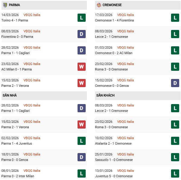- Trên sân nhà, Parma thắng 1, thua 1 trước Cremonese.