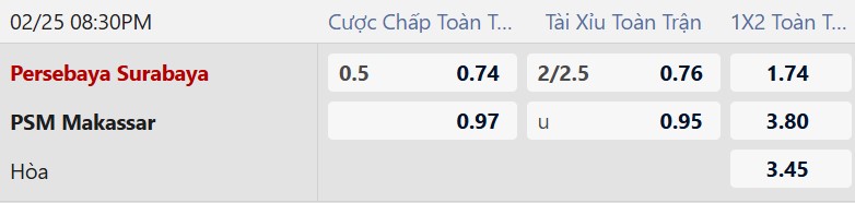 Thông tin tỷ lệ Persebaya vs PSM Makassar: