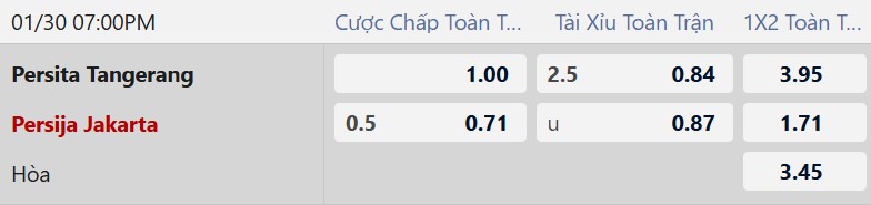 Thông tin tỷ lệ cược Persita Tangerang vs Persija:
