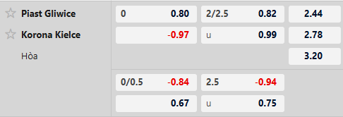 Thông tin tỷ lệ kèo Piast Gliwice vs Korona Kielce:
