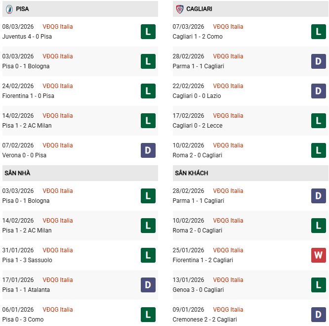 - Pisa hòa 3, thua 1 trong 4 trận gặp Cagliari gần đây.