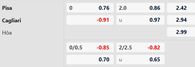 Thông tin tỷ lệ kèo Pisa vs Cagliari: