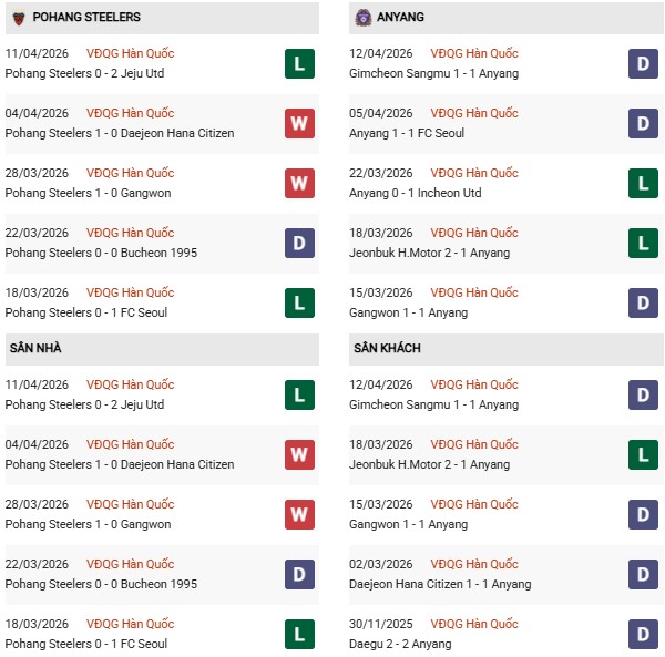 Thống kê phong độ Pohang Steelers vs Anyang: