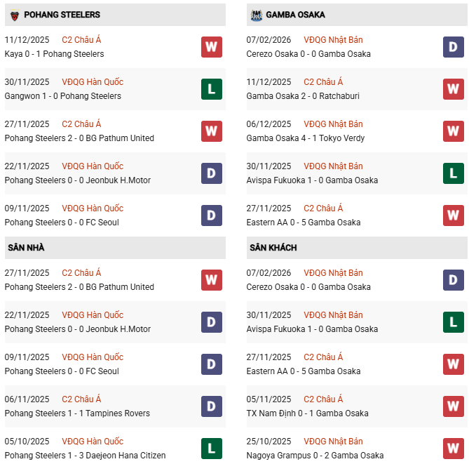 - Pohang Steelers đã đánh bại Gamba Osaka ở 2 lần gần gặp trước đó.