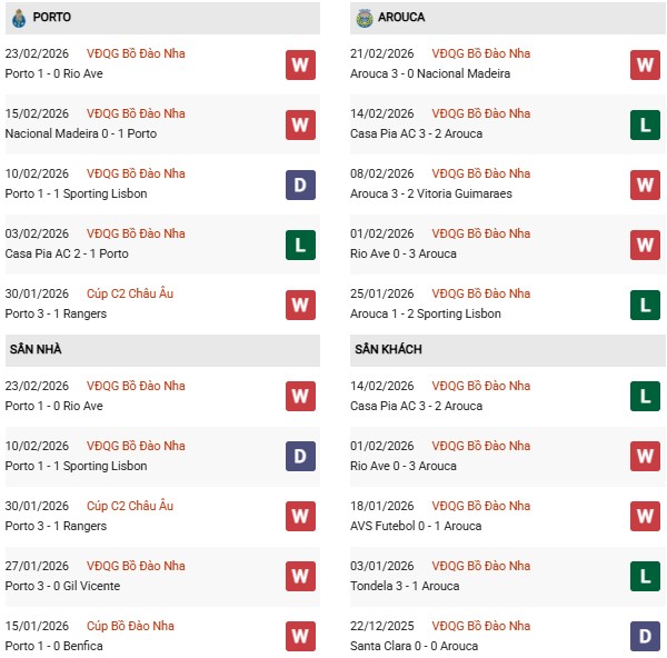 Nếu nhìn lại quá khứ, Arouca thua tận 15/18 cuộc đụng độ Porto vừa qua và cách biệt đa phần trên 1 bàn. Tựu trung lại, Porto không chỉ sẽ giành 3 điểm trọn vẹn mà thắng lợi phải tối thiểu 2 bàn.