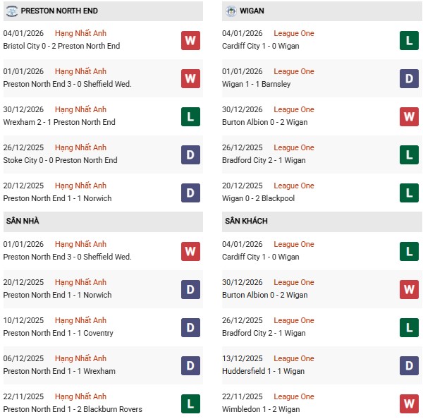 - Preston thắng 5, hòa 2, thua 3 trong 10 trận gặp Wigan gần đây.