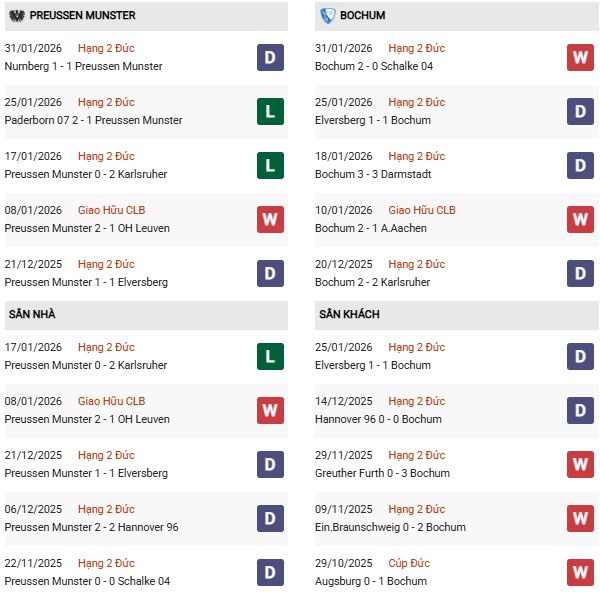 - Trên sân nhà, Preussen Munster thắng 1, thua 1 trước Bochum.