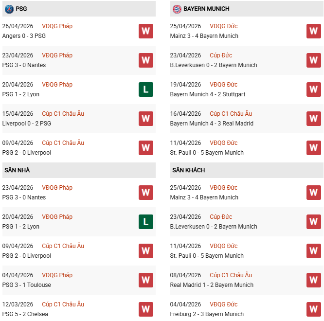 Thống kê phong độ PSG vs Bayern Munich: