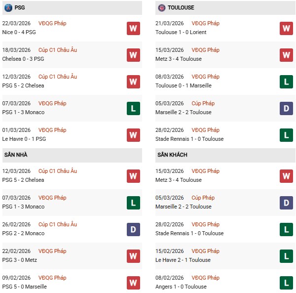 Điểm đáng chú ý là Toulouse thường chơi khá cởi mở, thể hiện qua trận thắng 4-3 trên sân Metz và trận hòa 2-2 trước Marseille ở Cúp Pháp. Tuy nhiên, khi phải làm khách trước các đội mạnh, hàng thủ của họ vẫn bộc lộ nhiều khoảng trống và dễ sụp đổ trước sức ép lớn.