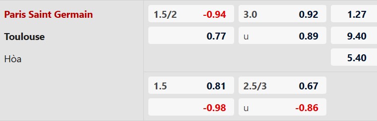 PSG chấp 1 3/4 bàn là mức kèo cao nhưng phù hợp với sự chênh lệch đẳng cấp và lợi thế sân nhà. Toulouse đang có tín hiệu tích cực, song rất khó đứng vững trước hàng công bùng nổ của PSG, đặc biệt khi đội chủ sân Parc des Princes cần 3 điểm để giữ ngôi đầu.