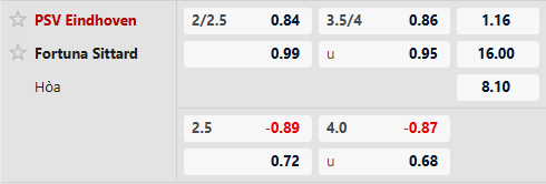 Chỉ tính riêng 2 trận đấu gần nhất, PSV Eindhoven có đến 9 lần xé lưới đối thủ và nạn nhân của họ đều là những đội bóng lớn như Napoli hay Feyenoord. 2 lượt trận ở mùa giải năm ngoái, PSV Eindhoven đã xé lưới Fortuna Sittard đến 7 lần. Thế nên bất chấp tỷ lệ tài xỉu lên đến 3 3/4, khả năng rất cao kèo đấu này vẫn sẽ về Tài chung cuộc.