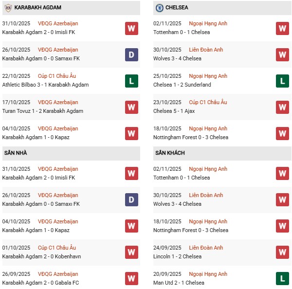 Không đội nào giữ sạch lưới nhà: Qarabag luôn xuyên thủng lưới đối phương ít nhất 1 lần ở 11/12 trận gần nhất, ở 5/6 trận sân nhà vừa qua. Trong khi đó, 4/6 trận gần đây của Chelsea đều khép lại mà không đội nào giữ sạch lưới nhà. Đặc biệt, Chelsea cũng luôn ghi bàn ở 9/10 chuyến xa nhà vừa qua.