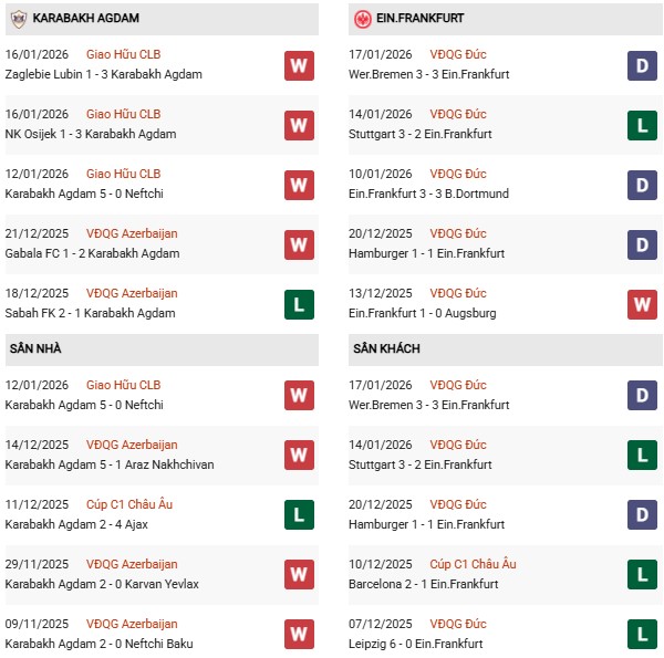 - Qarabag toàn thua cả 2 trận đối đầu Frankfurt gần đây.