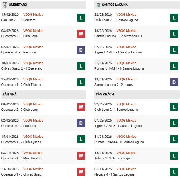 Thống kê phong độ Queretaro vs Santos Laguna: