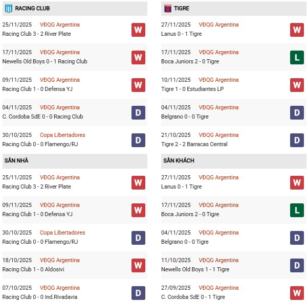 - Racing Club thắng 5, hòa 3, thua 2 trong 10 trận gặp Tigre gần đây.