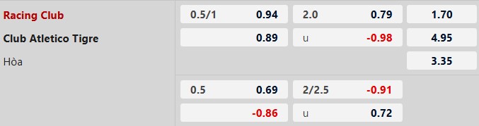 Thông tin tỷ lệ Racing Club vs Tigre: