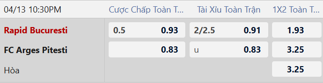Thông tin tỷ lệ kèo Rapid Bucuresti vs Arges: