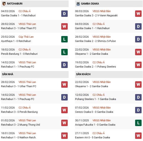 Thống kê phong độ Ratchaburi vs Gamba Osaka: