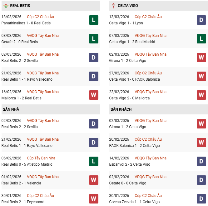 - Trên sân nhà, Real Betis thắng 4, thua 2 trước Celta Vigo.