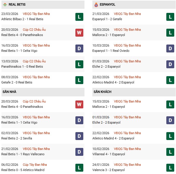 - Trên sân nhà, Real Betis thắng 5, thua 2 trước Espanyol.