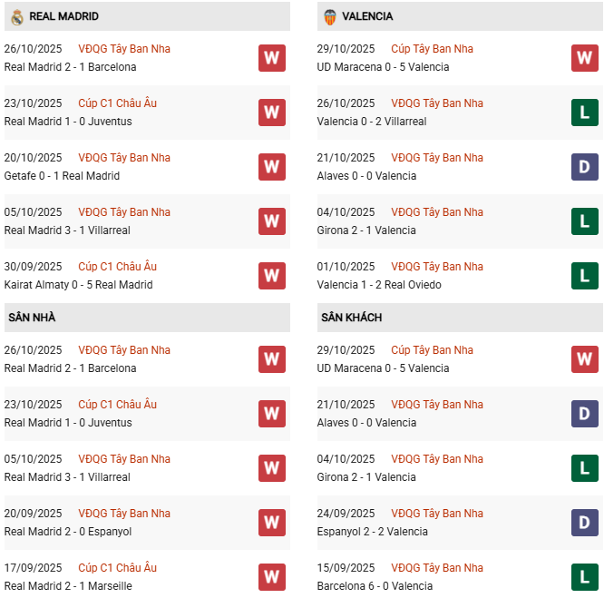 Thống kê phong độ Real Madrid đấu với Valencia: