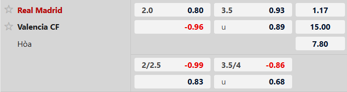 4 lần đụng độ gần nhất, Real Madrid đã có đến 10 lần xé lưới Valencia. Đáng chú ý, cả 4 trận đấu này đều về Tài chung cuộc với rất nhiều bàn thắng được ghi. Mùa giải năm nay, Real Madrid đã ghi đến 22 bàn sau 10 vòng và là đội sở hữu hiệu suất làm bàn tốt thứ 2 toàn giải. Vậy nên, dù tỷ lệ tài xỉu 3 1/2 là tương đối cao nhưng vẫn rất phù hợp dành cho sự xuất hiện của kèo Tài sau 90 phút.