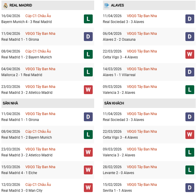 - Trên sân nhà, Real Madrid thắng 9, thua 1 trước Alaves.
