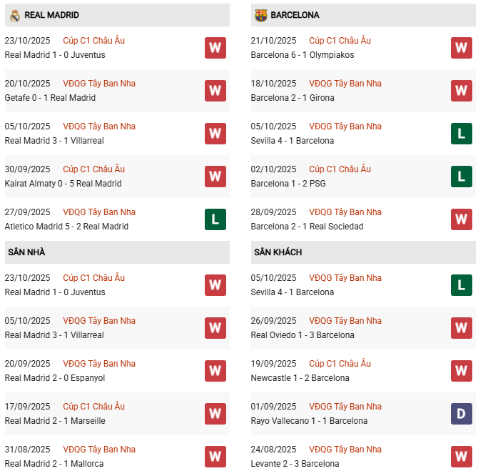 Thành tích đối đầu Real Madrid vs Barcelona: