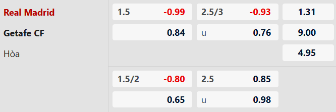 Thông tin tỷ lệ kèo bóng đá Real Madrid vs Getafe: