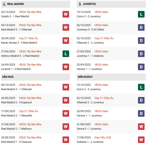 Thống kê phong độ Real Madrid vs Juventus: