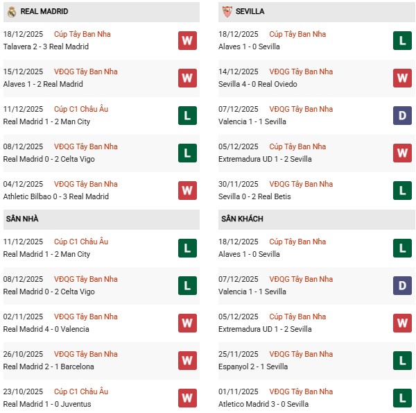 Thống kê phong độ Real Madrid vs Sevilla:
