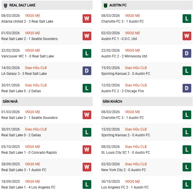 - Trên sân nhà, Real Salt Lake thắng 4, thua 1 trước Austin.