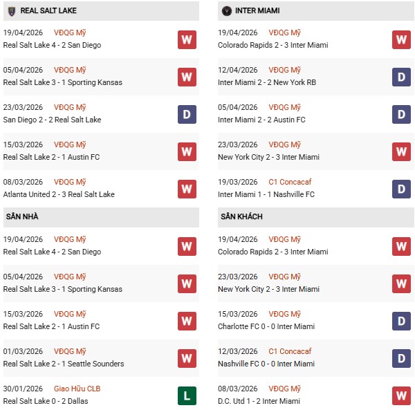 Real Salt Lake vừa ghi tới 4 bàn vào lưới San Diego, trong khi Inter Miami cũng thường xuyên góp mặt trong các trận đấu có nhiều bàn thắng (vừa thắng Colorado 3-2 và hòa New York RB 2-2). Hàng công của cả hai đều đang đạt điểm rơi phong độ tốt, trong khi hàng thủ vẫn chưa thực sự mang lại sự an tâm tuyệt đối. Một trận cầu cởi mở với nhiều pha lập công từ cả hai phía là kịch bản rất dễ xảy ra.