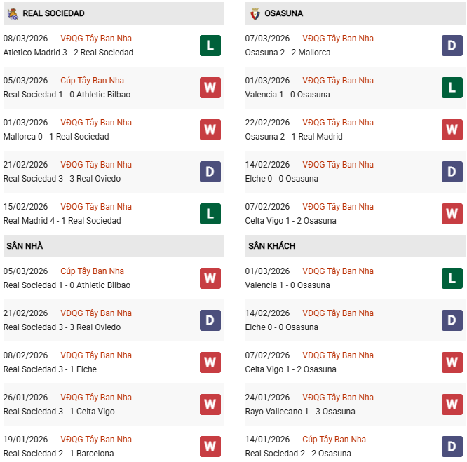 2 năm trở lại đây, Osasuna đã không còn e ngại Sociedad như trước: thua đúng 2/6 cuộc đụng độ giữa đôi bên (xét 90 phút). Mới nhất vào tháng 1/2026, Osasuna chỉ gục ngã sau loạt luân phiên 11m tại Reale Arena ở vòng 1/8 Copa del Rey. Vì vậy, Osasuna được dự đoán sẽ mang điểm số về nhà.