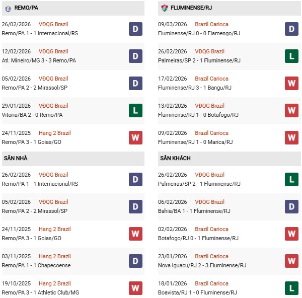 Thống kê phong độ Remo vs Fluminense: