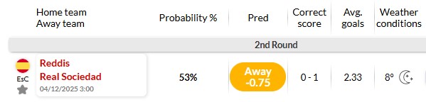 Dù Sociedad mạnh hơn rất nhiều, mức chấp 3/4 bàn cho thấy đội khách thường không thắng quá đậm trên sân khách. Reus FC lại chơi sân nhà khá tốt và có khả năng phòng ngự kỷ luật. Tuy nhiên, xét tổng thể, Sociedad vẫn là đội đủ sức kiểm soát hoàn toàn thế trận và cầm tấm vé đi tiếp nhờ sự khác biệt về chất lượng cầu thủ. Chỉ cần thi đấu đúng sức, đại diện La Liga hoàn toàn có thể vượt kèo.