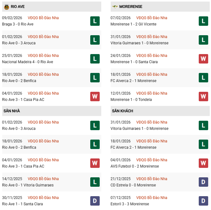 • Hiệu suất ghi bàn: Rio Ave đang gặp vấn đề lớn trong khâu dứt điểm (không ghi bàn ở 4 trận gần nhất). Moreirense khi thi đấu xa nhà thường ưu tiên sự chắc chắn, với 5 trận khách gần nhất của họ đều có kết quả dưới 2.5 bàn thắng.